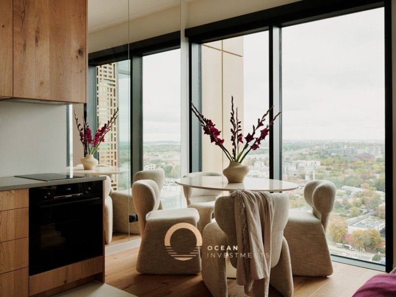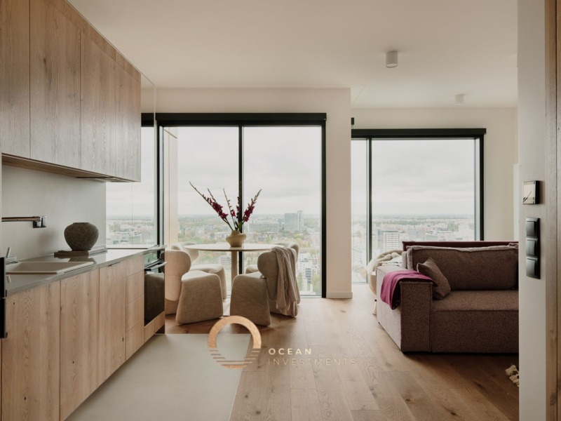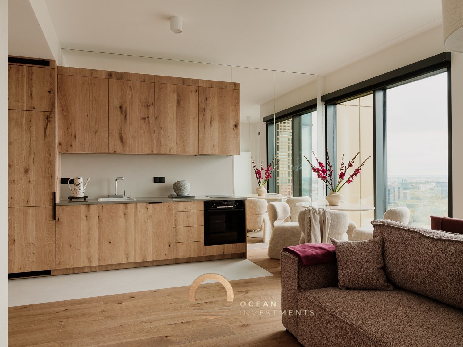 Mieszkanie jest zupełnie nowe, nigdy wcześniej niezamieszkały, wykończony w wysokim standardzie, a panoramiczne przeszklenia zapewniają spektakularny widok na centrum Warszawy.