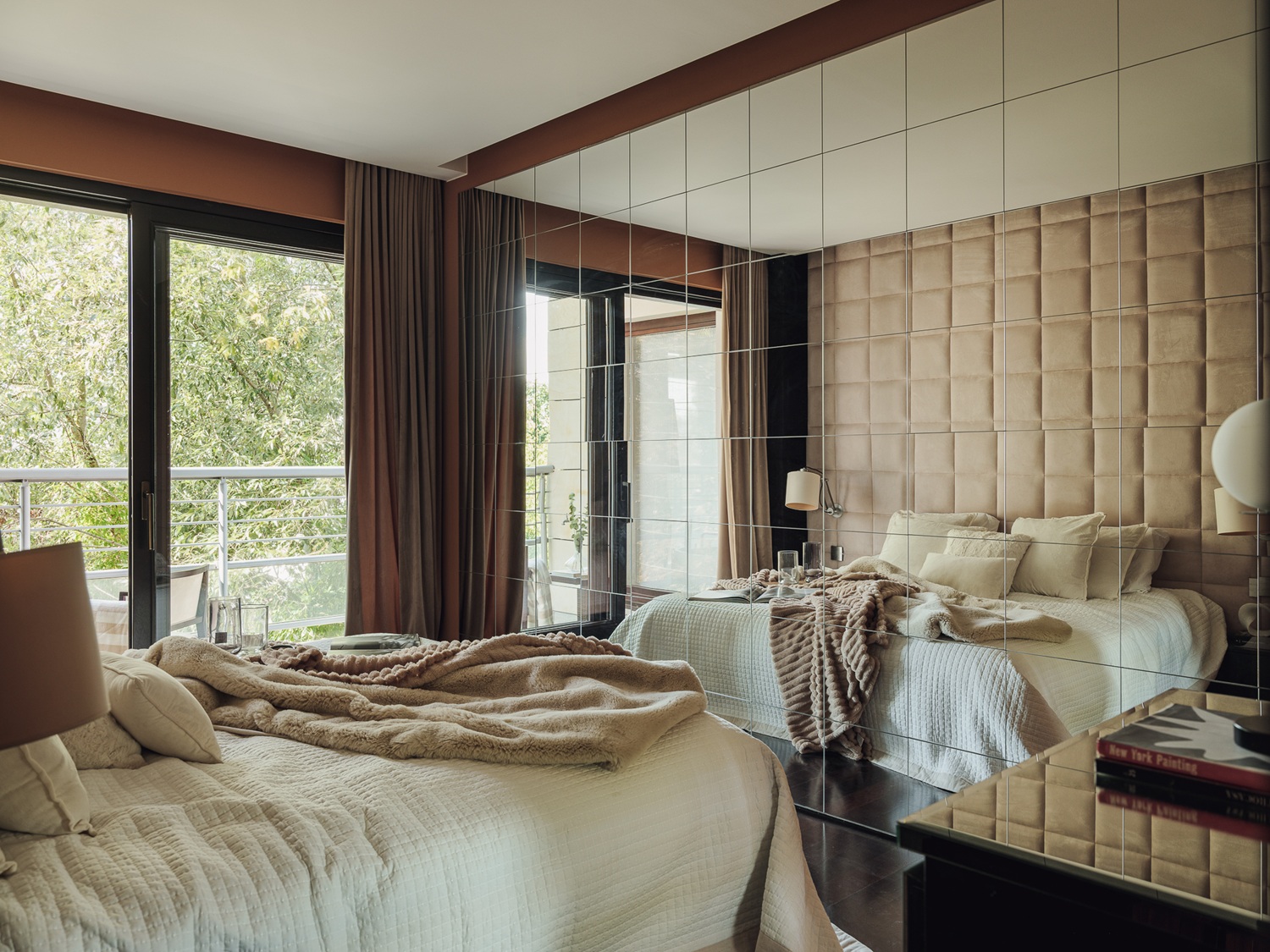 –> w sypialni ściana za łóżkiem obita naturalną skórą alcantara,