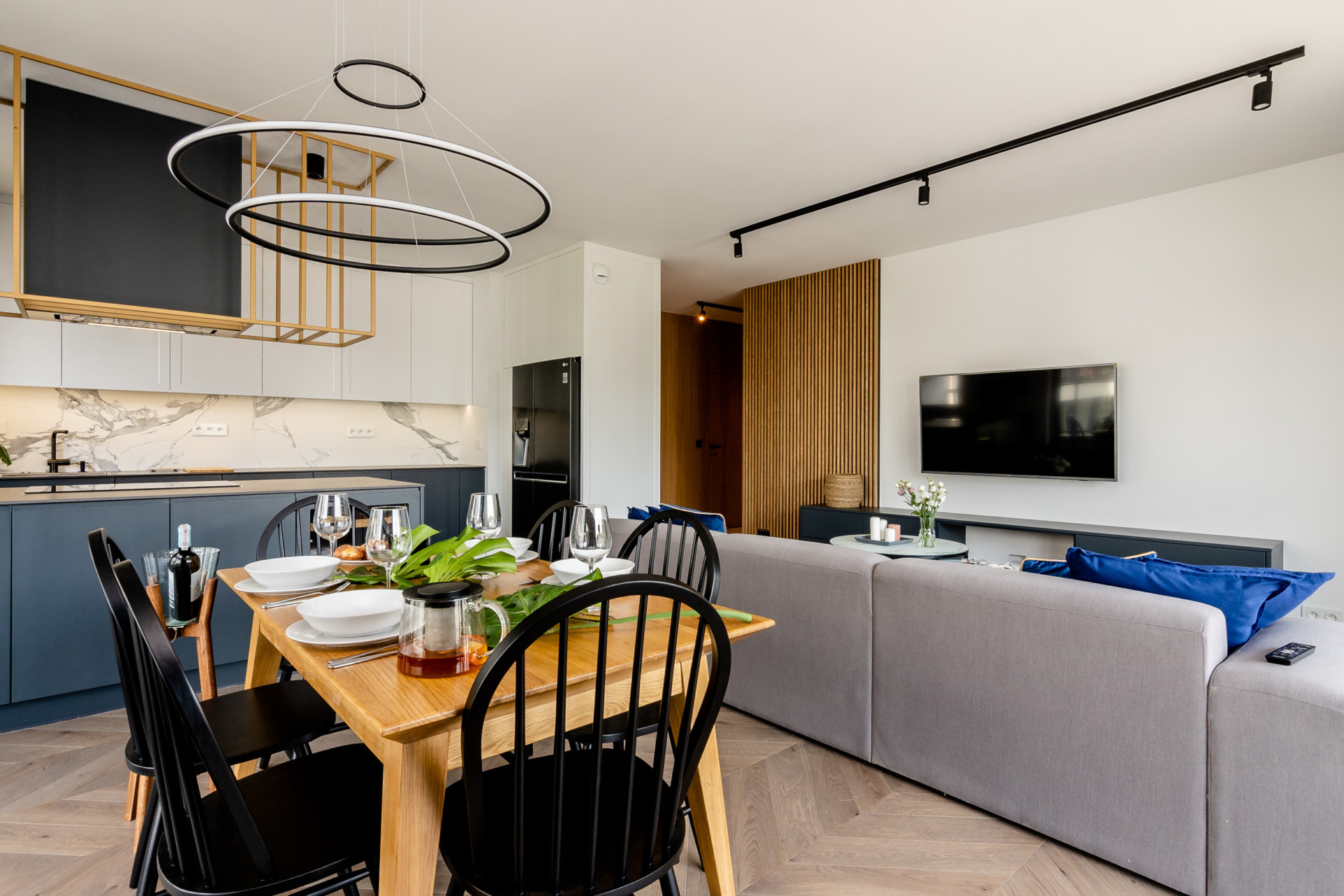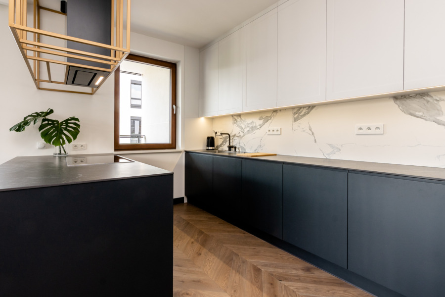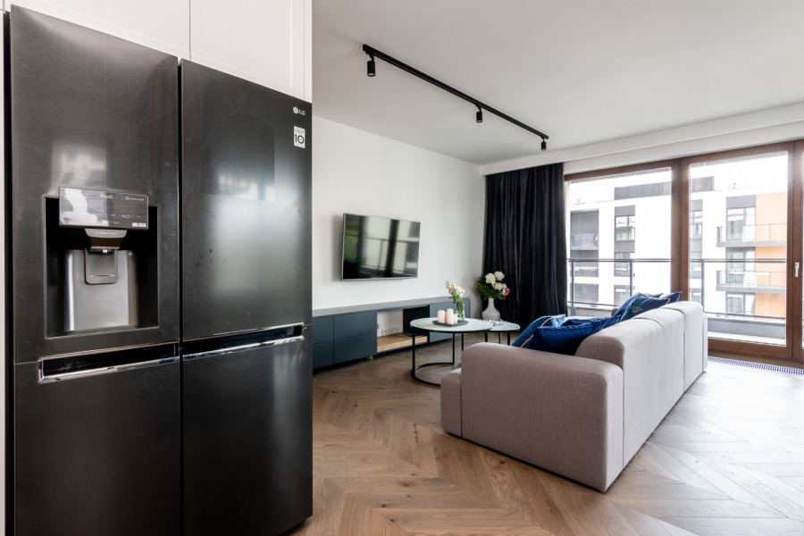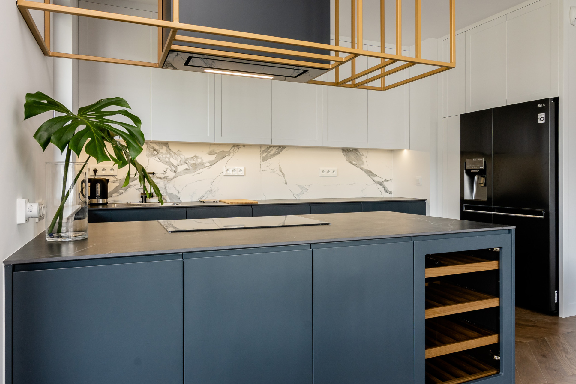 Na zamówienie wykonano stolarkę, zastosowano granitowe blaty w kuchni i łazience, a elegancję wnętrza podkreśla lodówka na wino oraz sprzęty AGD marki Gaggenau.