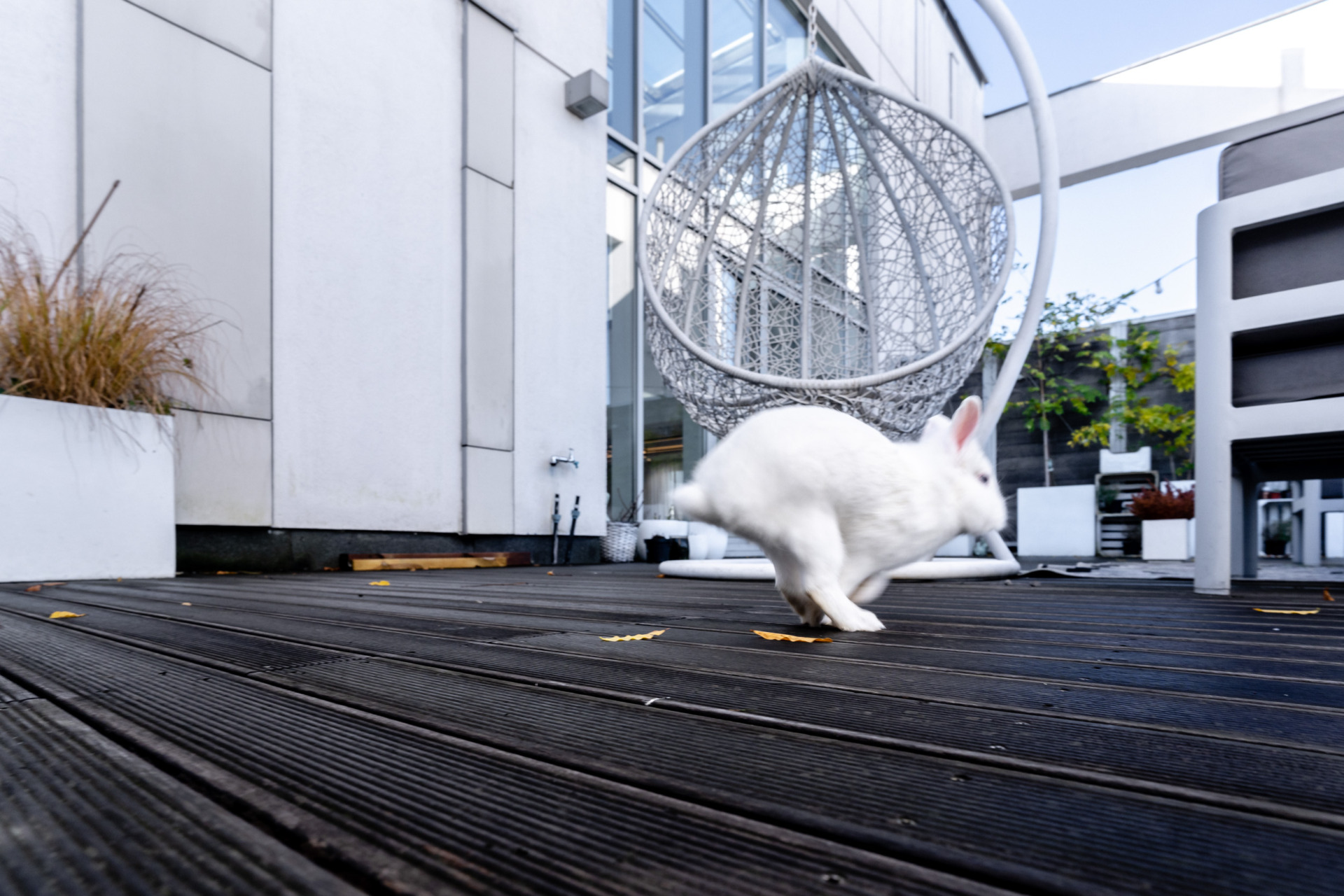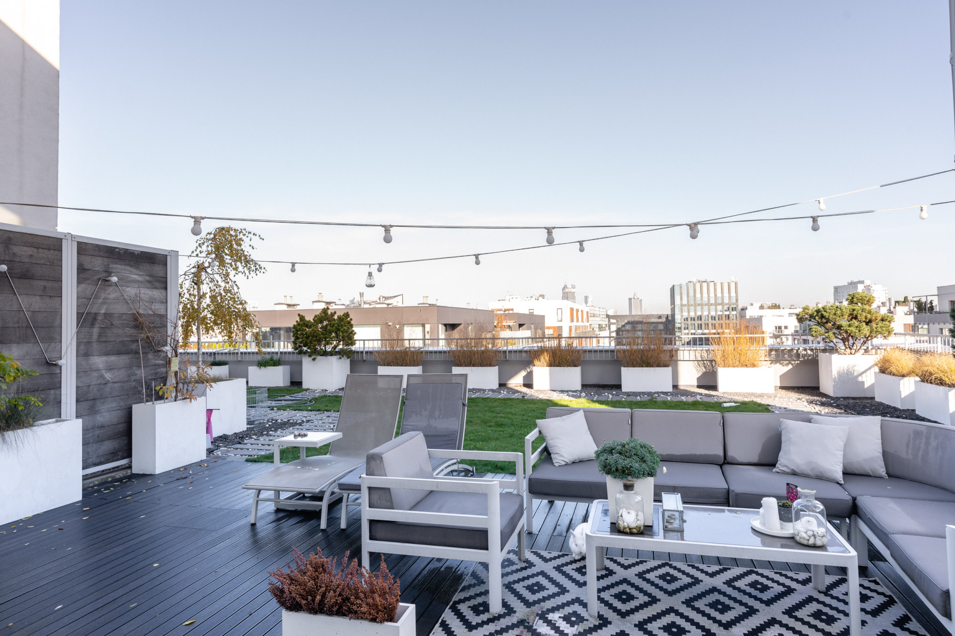 Przedłużeniem apartamentu jest taras z dużym ogródkiem, z którego rozpościera się piękny widok na panoramę miasta. Dwa poziomy apartamentu połączone zostały spektakularnymi białymi schodami wykończonymi taflami szkła.