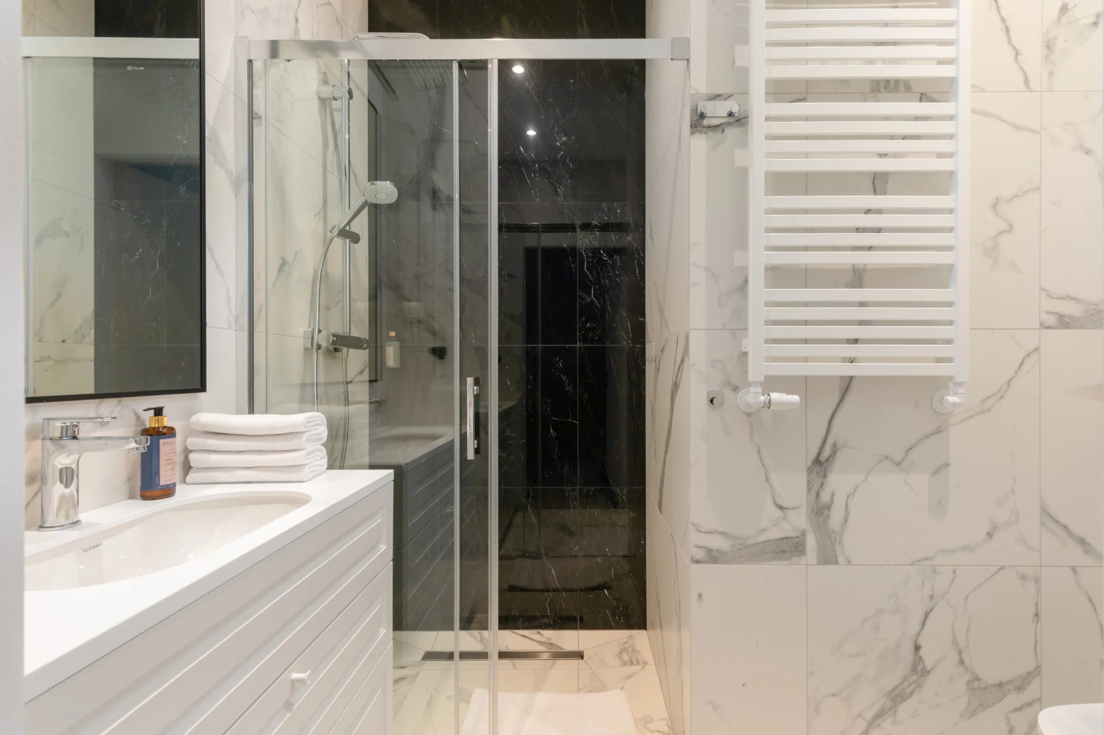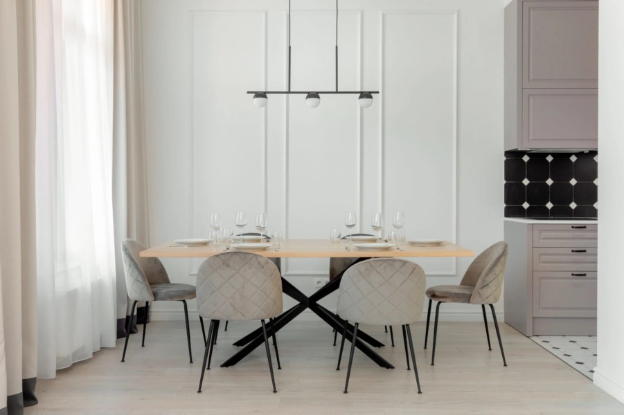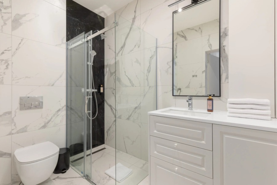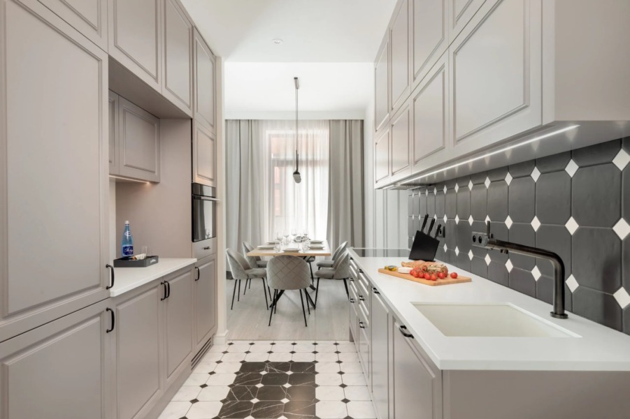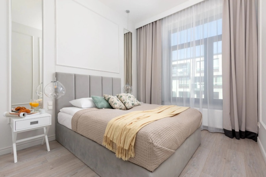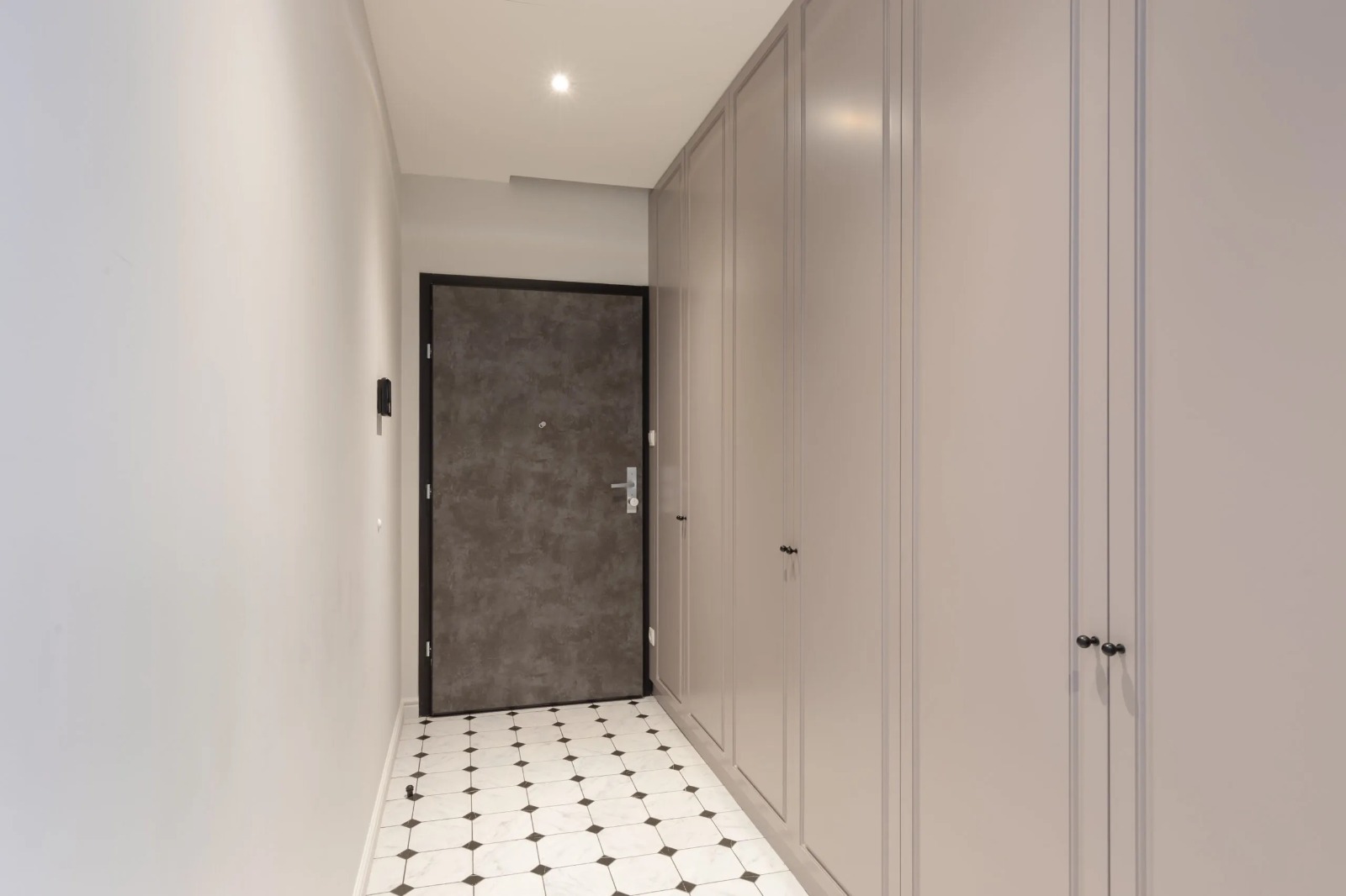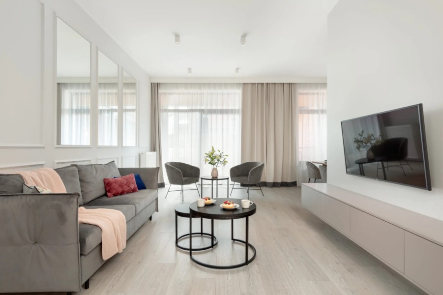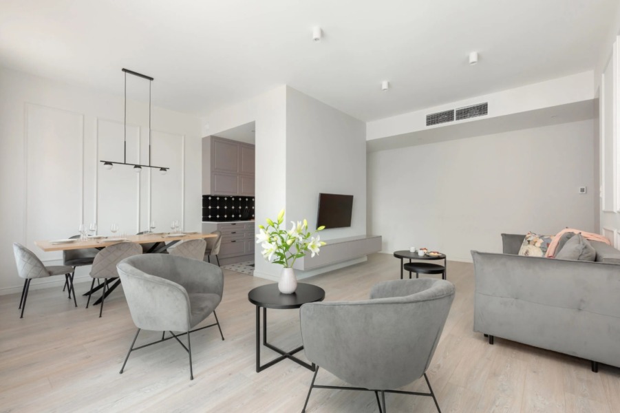 Jeśli cenisz sobie ponadczasową elegancję, to ten apartament z pewnością Cię zainteresuje. Apartament wykończony jest w stylu nowojorskim, który charakteryzuje się przede wszystkim sztukaterią, lamperiami oraz zdobionymi listwami. Wnętrza są urządzone w stonowanym glamour, a wzrok przyciągają materiały takie jak pikowane obicia kanap, welur oraz różnorodność wykorzystanych deseni.