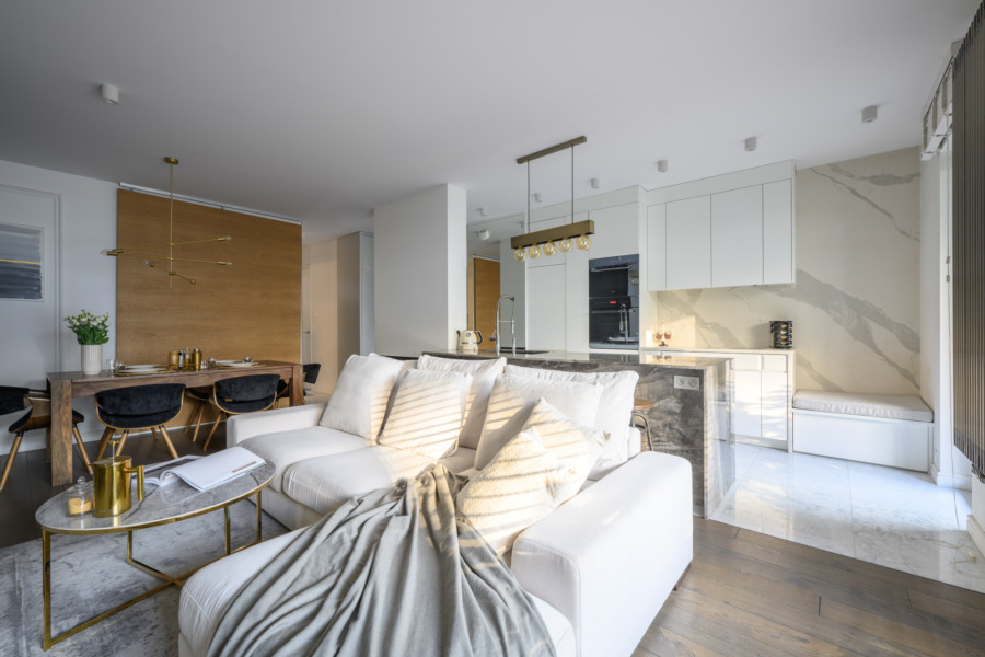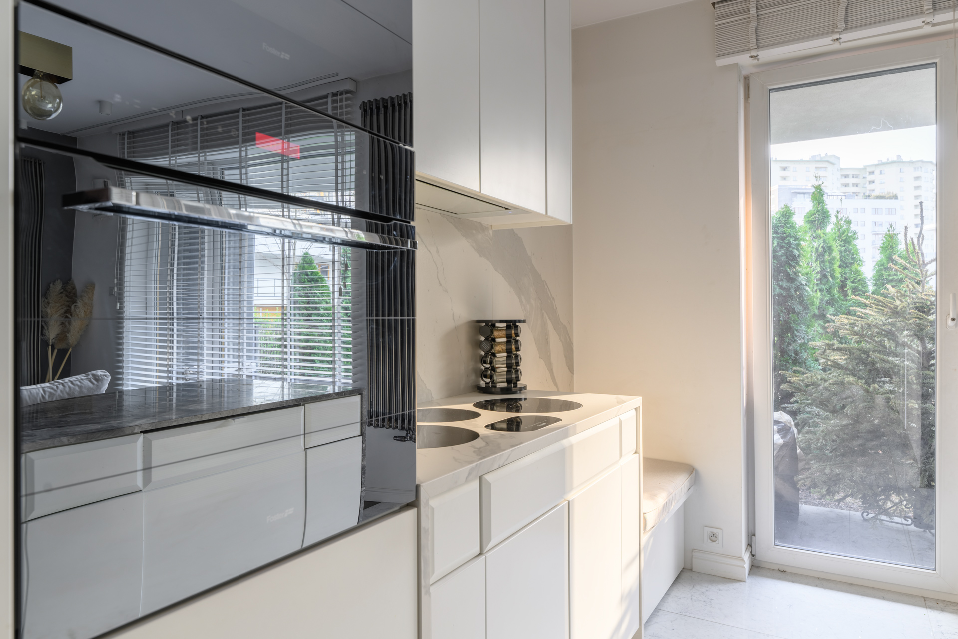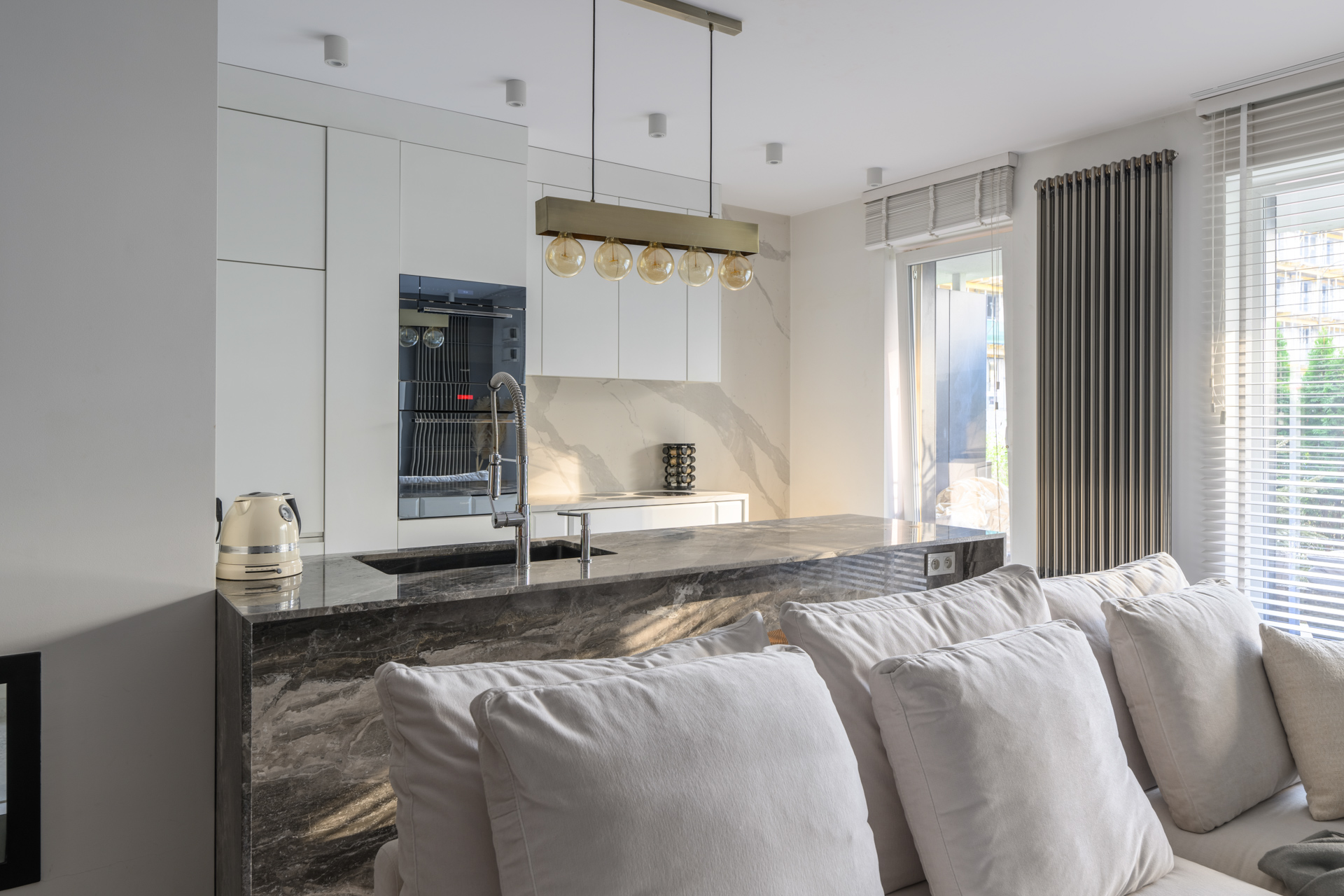 Wyjątkowe materiały wykończeniowe, takie jak kamień naturalny marmur Carrara C Extra, drewno dębowe Dąb Awenir oraz spiek Laminam Statuario Venato, nadające mieszkaniu ekskluzywny charakter. Starannie wykonane zabudowy stolarskie. Luksusowy sprzęt AGD włoskiej firmy Foster SPA, zapewniający najwyższą jakość i nowoczesność w codziennym użytkowaniu.