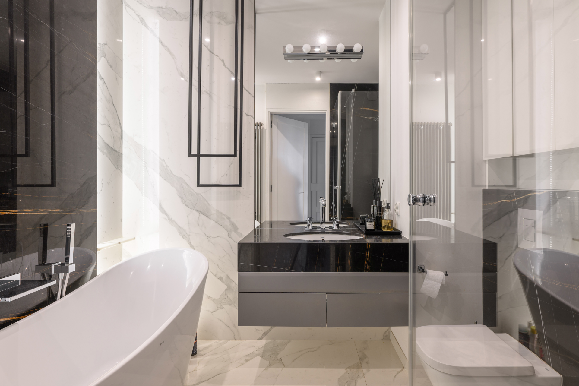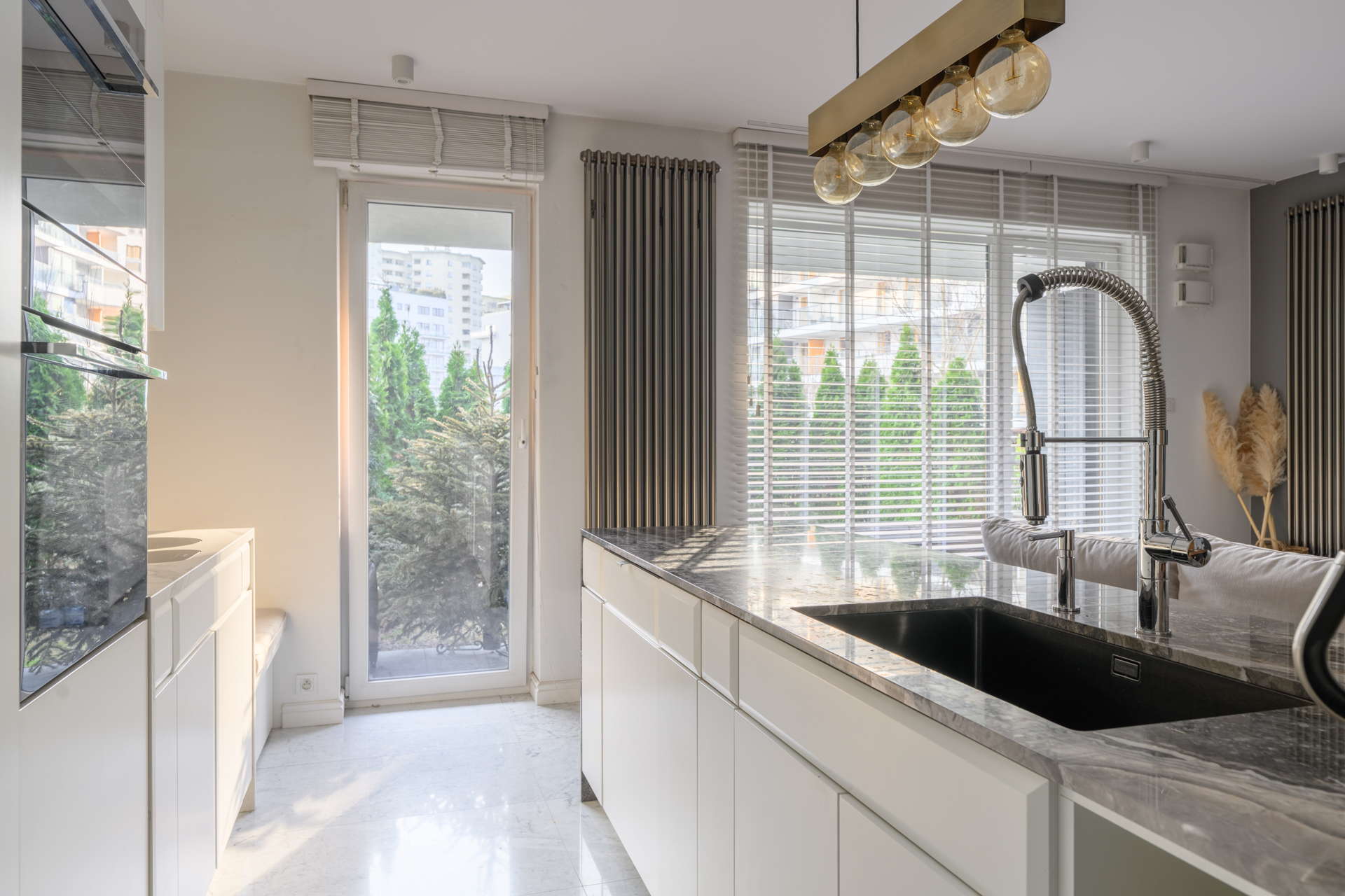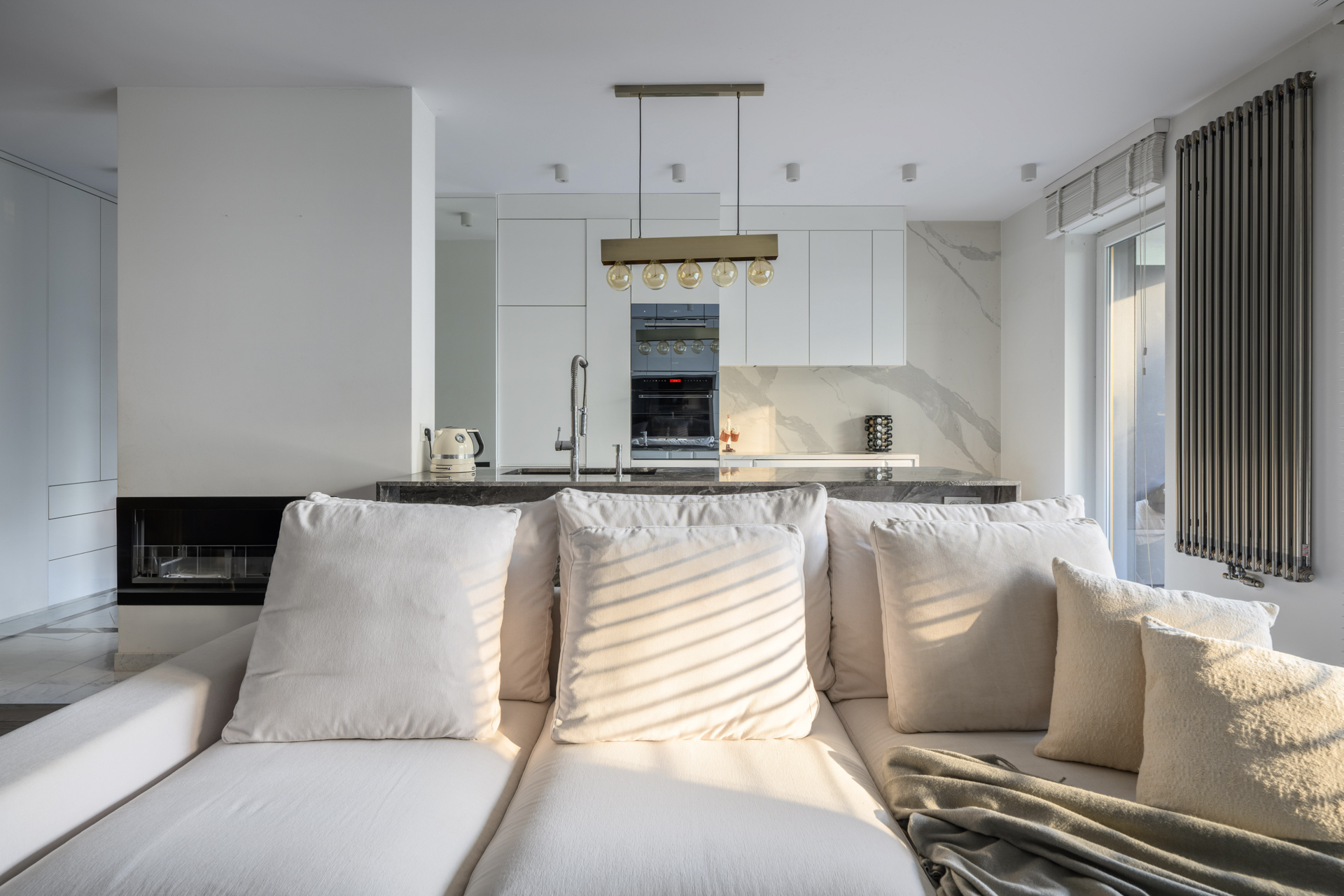 Wyjątkowe materiały wykończeniowe, takie jak kamień naturalny marmur Carrara C Extra, drewno dębowe Dąb Awenir oraz spiek Laminam Statuario Venato, nadające mieszkaniu ekskluzywny charakter. Starannie wykonane zabudowy stolarskie. Luksusowy sprzęt AGD włoskiej firmy Foster SPA, zapewniający najwyższą jakość i nowoczesność w codziennym użytkowaniu.