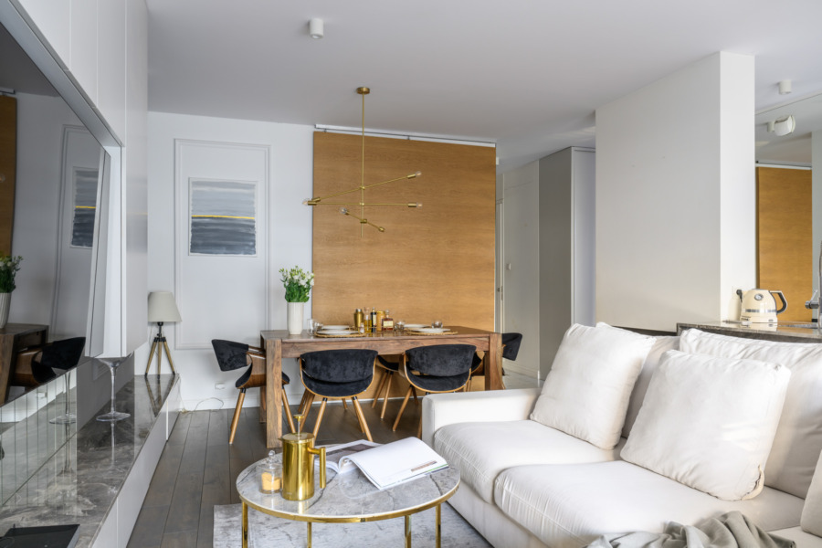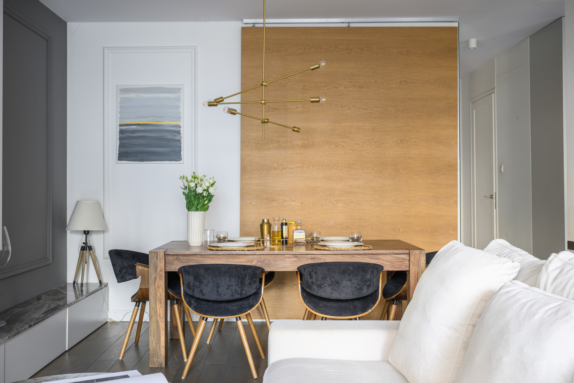 Apartament znajduje się w dzielnicy Mokotów. Bliskość metra Wilanowska, sklepów oraz innych punktów usługowych sprawia, że mieszkanie stanowi doskonałą bazę dla aktywnego życia miejskiego.