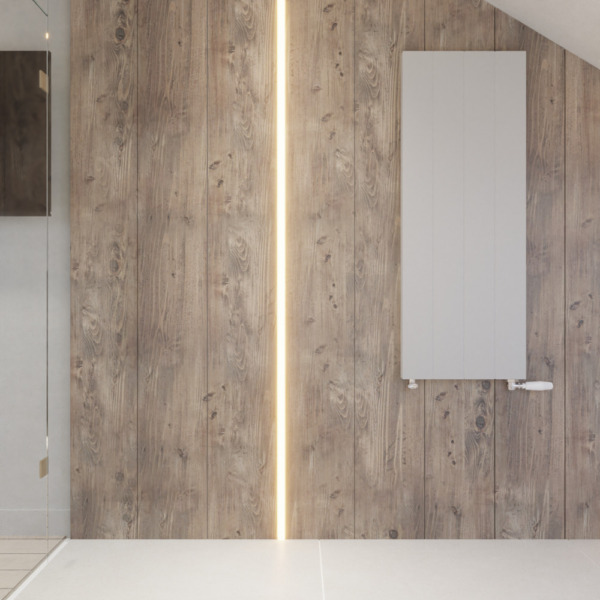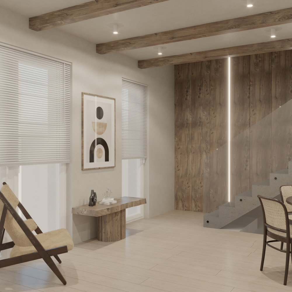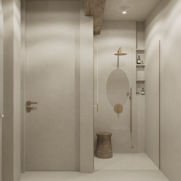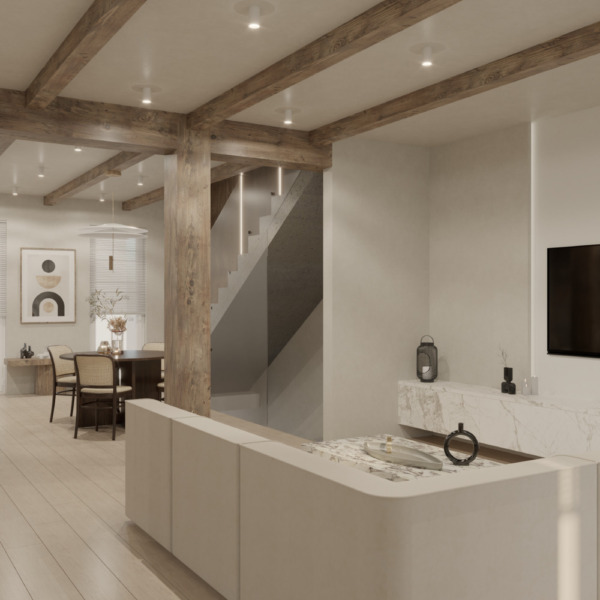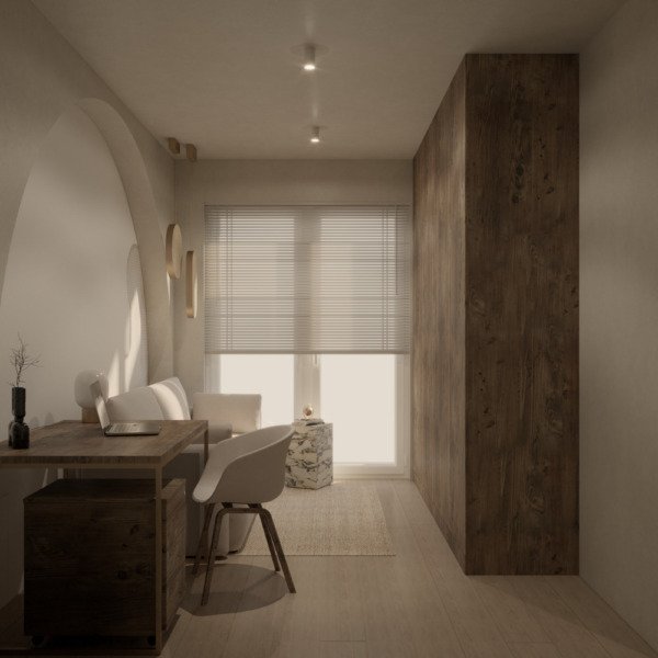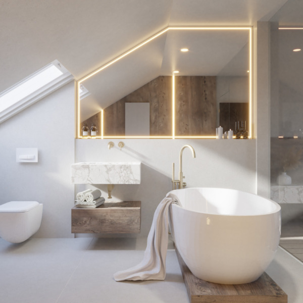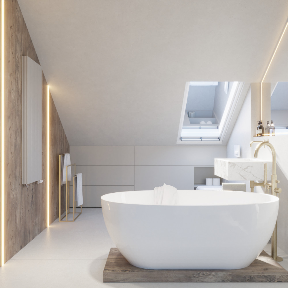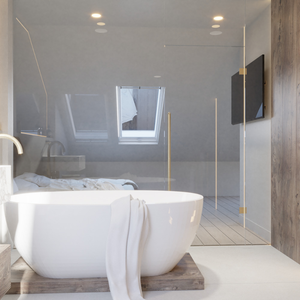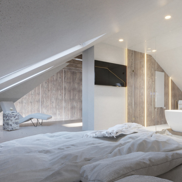Wizualizacja przedstawia podział na strefę dzienna z wyszczególnieniem: reprezentacyjnej części wejściowej przez którą przechodzi się do przestronnego salonu połączonego z kuchnią oraz części gabinetowej z łazienką z prysznicem. Drugie piętro składa się z dużej przestrzeni łączącej parter i piętro, która przechodzi w imponujący masterbedroom z przepiękną łazienką z wanną.