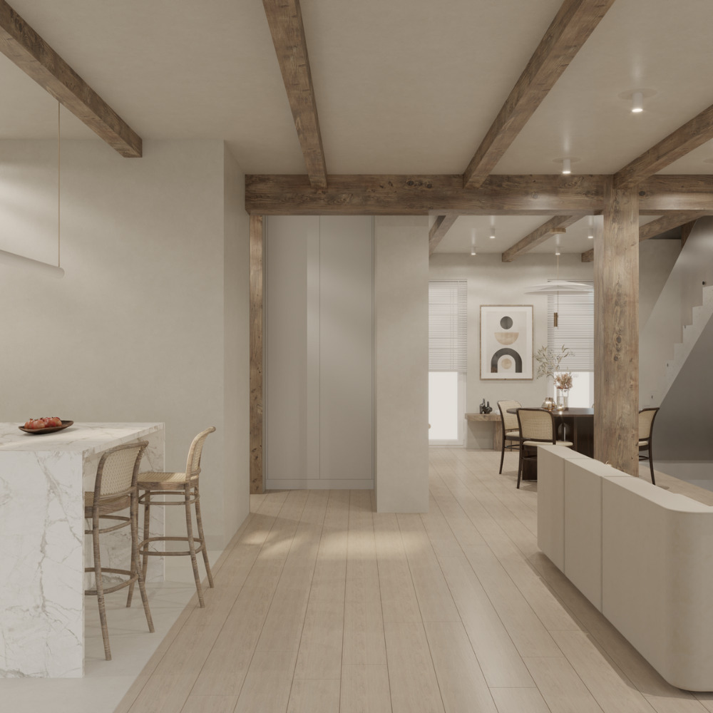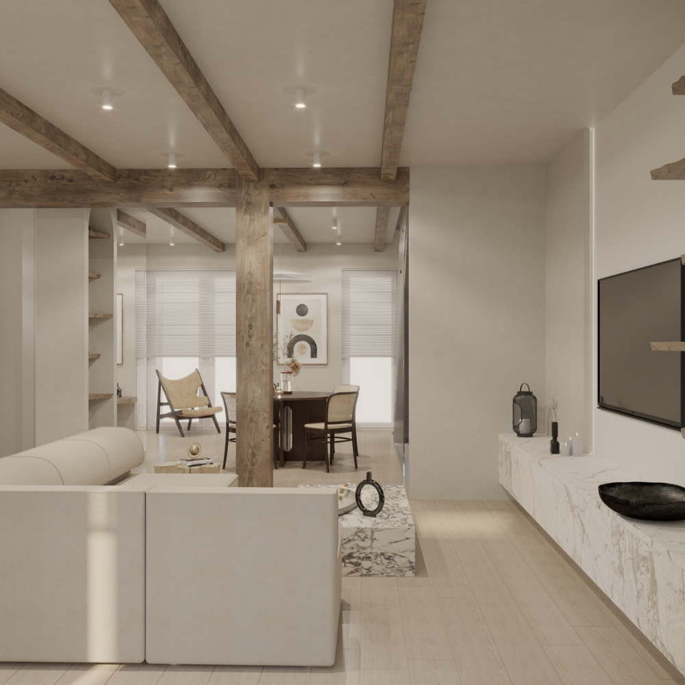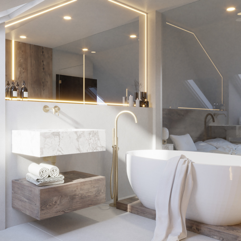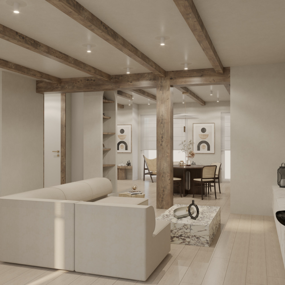 Możliwości aranżacyjnych tej przestrzeni jest wiele, dzięki czemu można uzyskać nawet do 4 odrębnych sypialni na dwóch piętrach. Mieszkanie może być kompaktowe zarówno dla pary jak i dla rodziny 2+3
