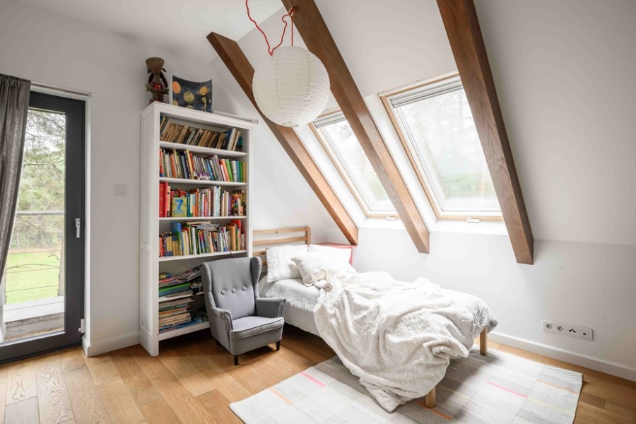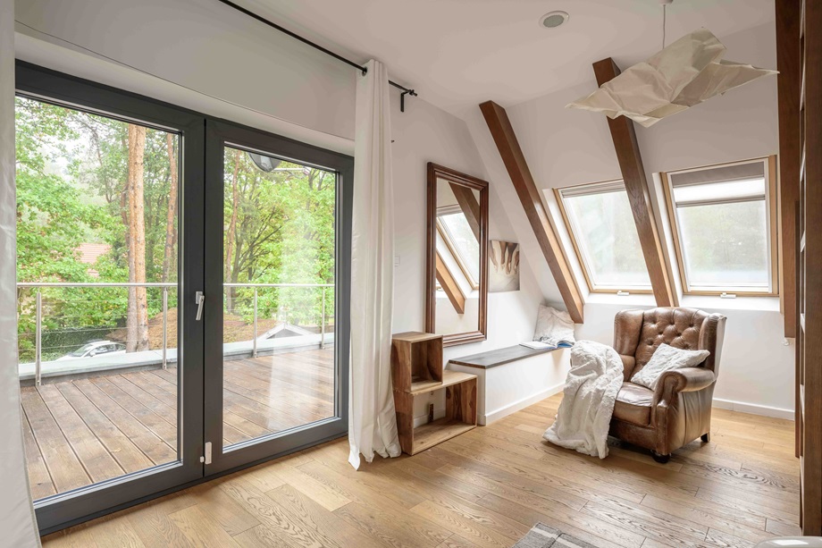 Na pierwszym piętrze zlokalizowana jest sypialnia master z własną garderobą i pięknym tarasem z widokiem na las. Łazienka na tym piętrze jest również przeszklona i wyposażona w wannę, prysznic oraz dwa zlewy. Dodatkowo, na pierwszym piętrze znajduje się gabinet oraz dwie sypialnie, z których można wyjść na balkon.