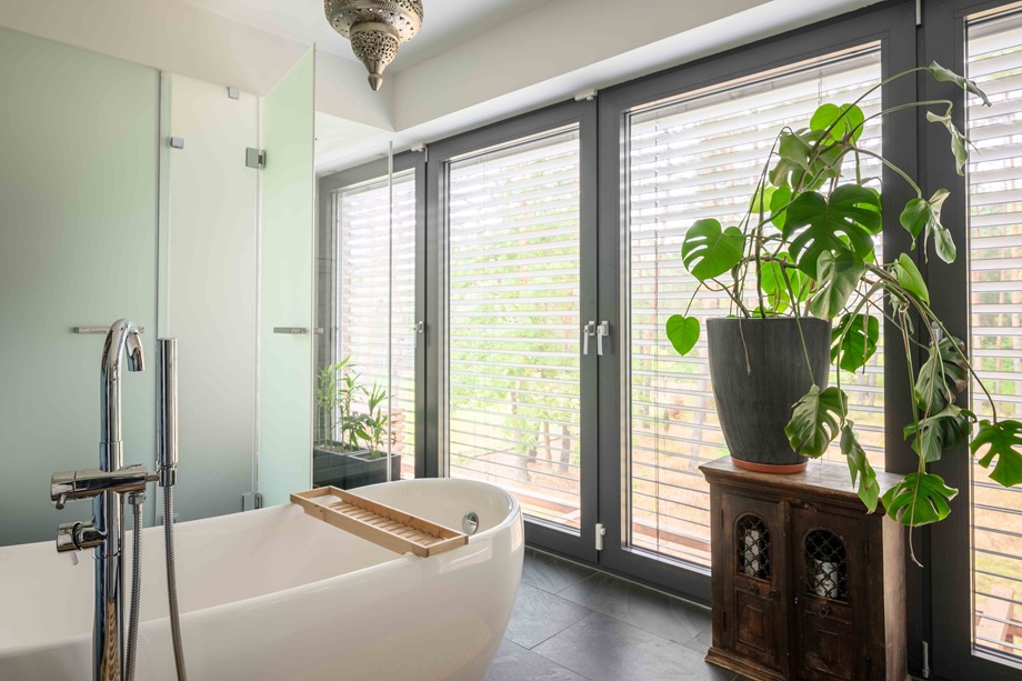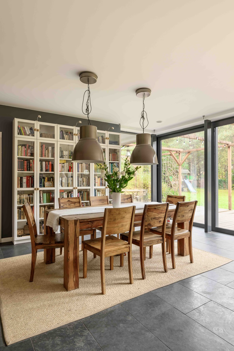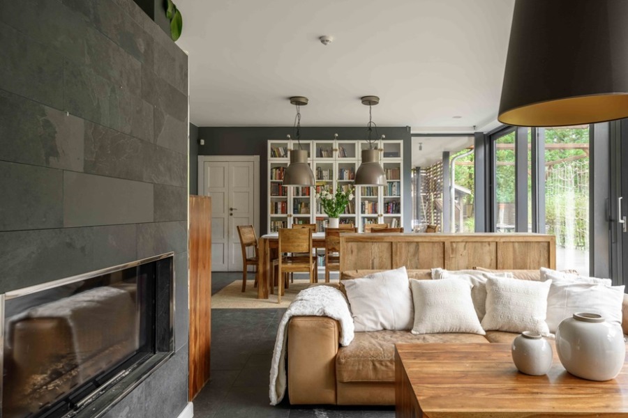 Ta rezydencja to prawdziwy przykład ekologicznego podejścia do życia. Zainstalowane urządzenie szwajcarskiej firmy Zehnder, działające jako pompa ciepła i rekuperator, gwarantuje nie tylko efektywne ogrzewanie, ale także świeże i czyste powietrze w całym domu. Urządzenie to korzysta z czterech pionowych odwiertów o głębokości około 80 metrów, aby dostarczać energię potrzebną do ogrzewania oraz wentylacji. Przy ogrzewaniu dużą rolę odgrywa także kominek z płaszczem wodnym, który rozprowadza ciepło po całym domu.