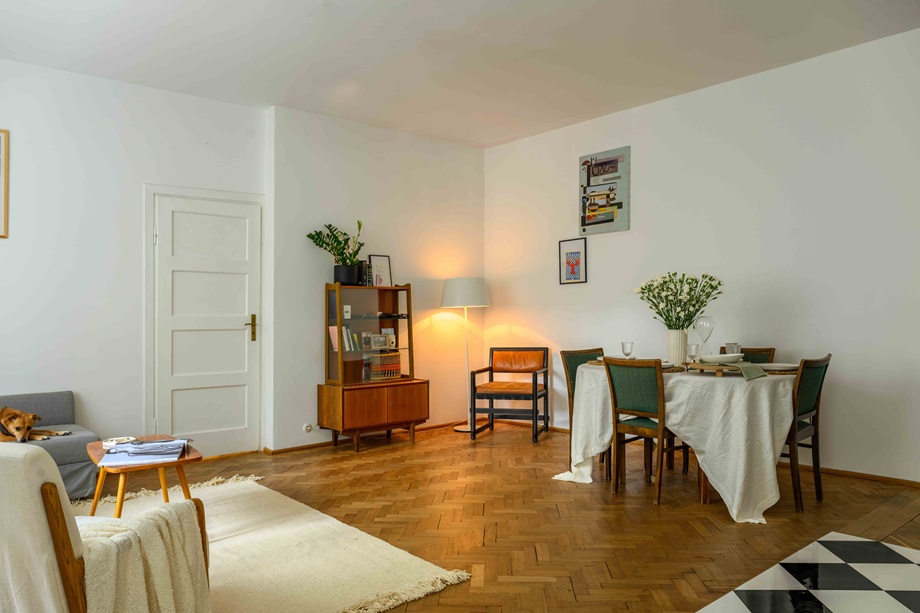 Piękny drewniany parkiet oraz oryginalna stolarka drzwiowa nadają wnętrzu wyjątkowego uroku.