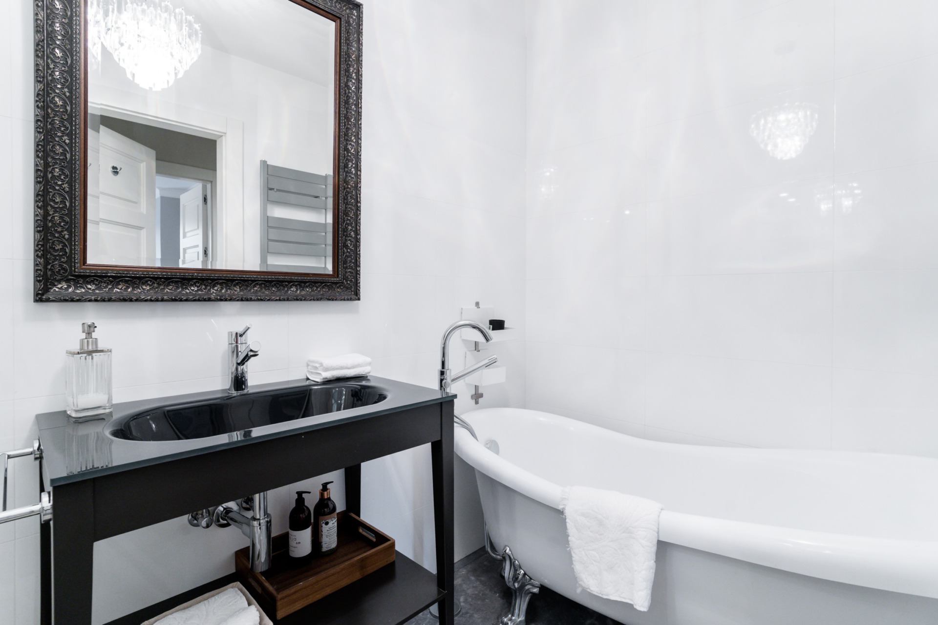 głównej łazienki wyposażonej w wannę, garderoby, balkonu. Całe mieszkanie urządzone w spójnym