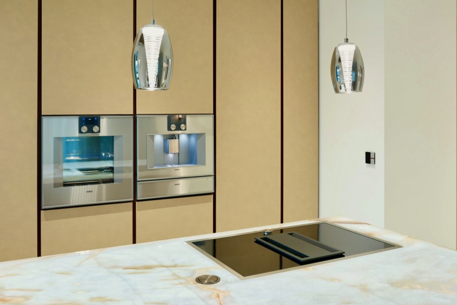 – Sprzęt AGD marki GAGGENAU – Zmywarka, Lodówka, Płyta z Okapem, Szuflada do podgrzewania, Piekarnik, Ekspres, (najwyższa seria 400 otwierana na dotyk, ekspres z bezpośrednim podłączeniem do wody i odpływu)