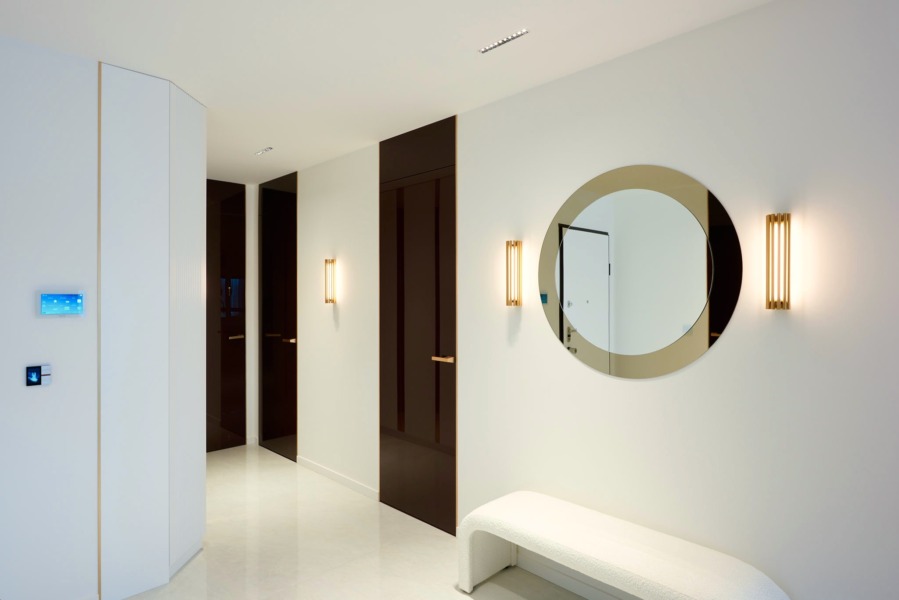 – Drzwi wewnętrzne 250 cm pokryte brązowym szkłem z mosiężnym obramowaniem i klamkami z ukrytymi rozetami