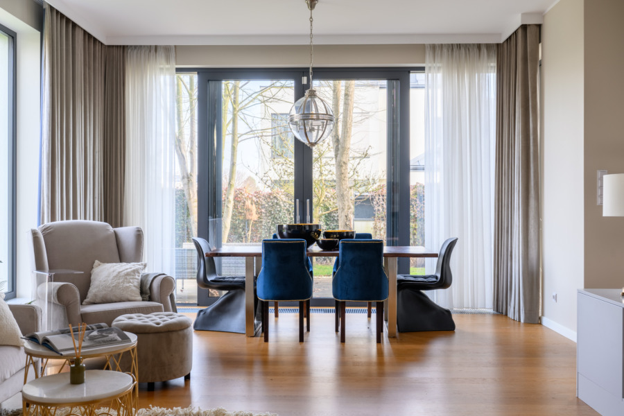 Dom został wykończony najlepszej jakości materiałami: spieki na podłodze w kuchni, drewniane podłogi, wysokiej klasy armatura, podgrzewane podłogi w łazienkach, robione na zamówienie drzwi oraz zabudowy – możliwość przekazania kontaktu do każdego wykonawcy.