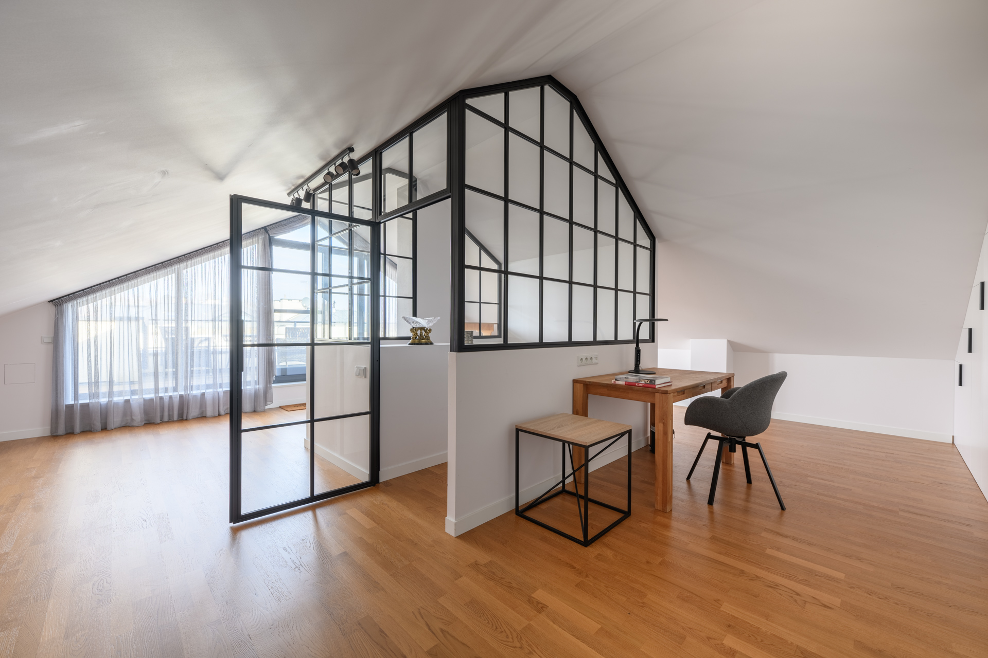 Zostało przerobione na biuro w stylu loftowym; może również służyć jako pokój dla nastoletniego dziecka (zostały wyprowadzone rury, dzięki czemu można zrobić dodatkową toaletę).