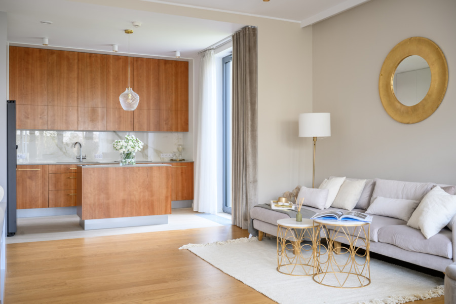 Otwarta kuchnia z salonem, zamykany na drzwi pokój dzienny, który może służyć jako gabinet/czytelnia, toaleta, pomieszczenie gospodarcze.