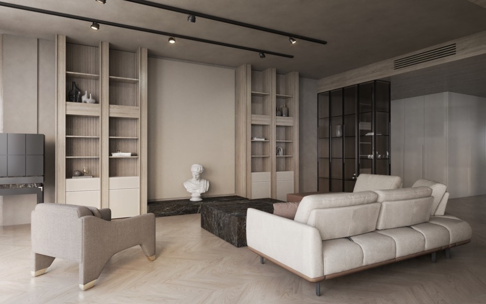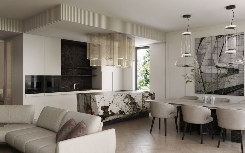 Całość uzupełnia różnorodne oświetlenie w postaci opraw wpuszczanych w sufity podwieszane, jak również lamp dekoracyjnych i natynkowych.