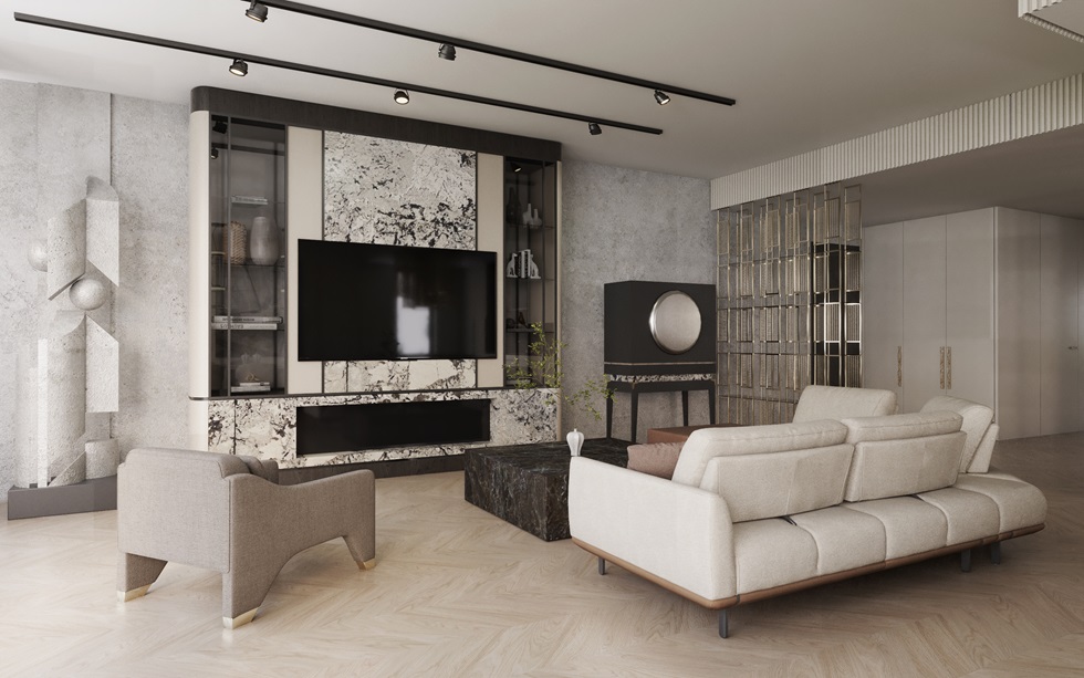 Korytarze części wspólnych wykończone są w kamieniu naturalnym, a charakterystyczna elewacja z efektem falującej tekstury jest jednym z najbardziej znanych budynków współczesnej Warszawy.
