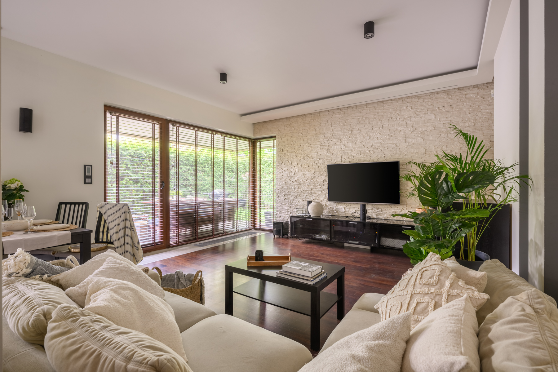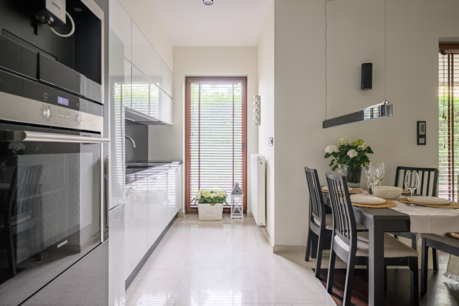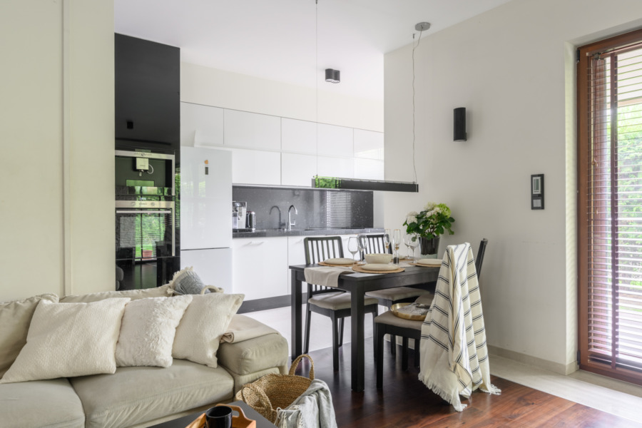 -Salon z kuchnia i wyjściem na ogród