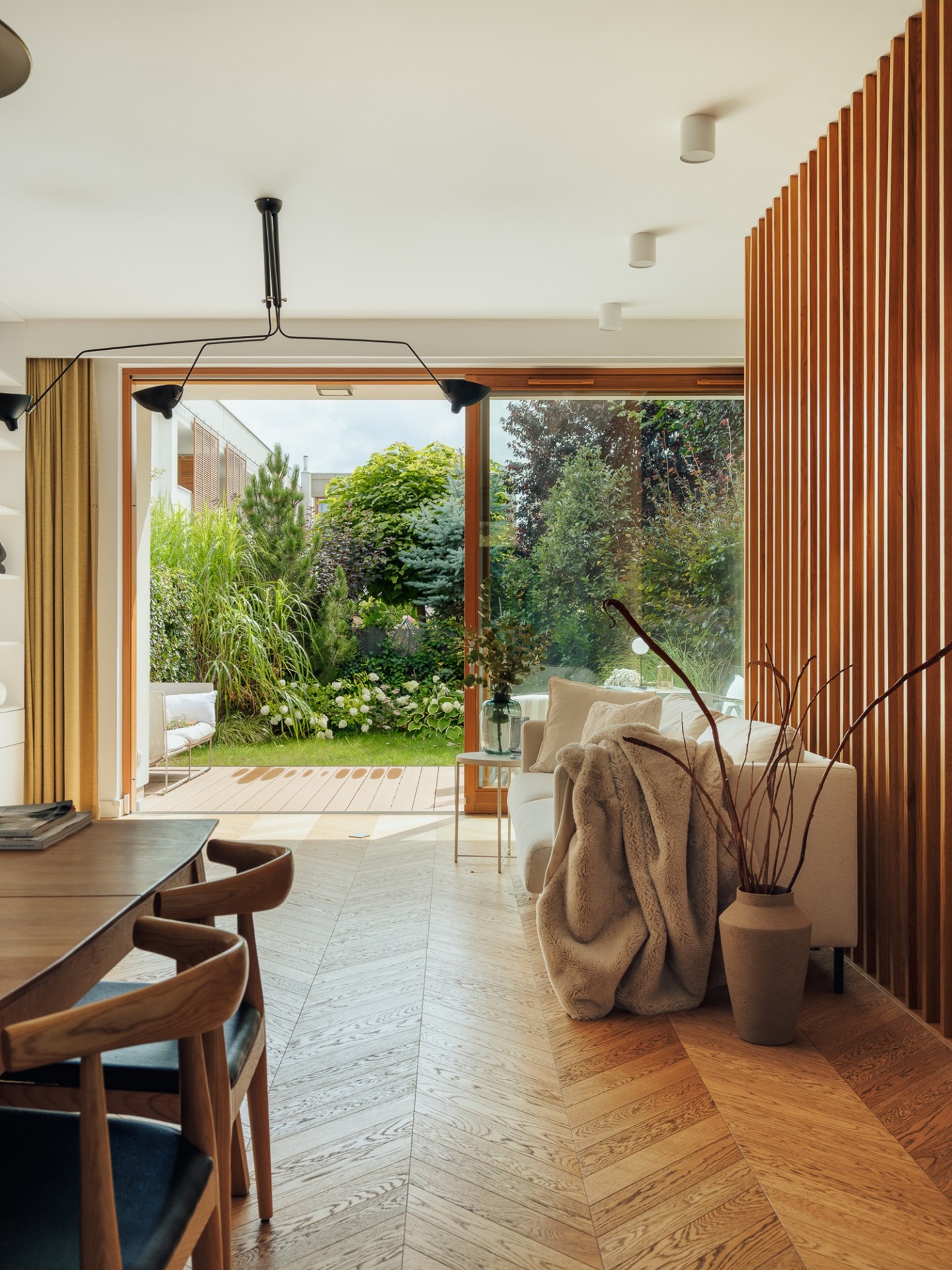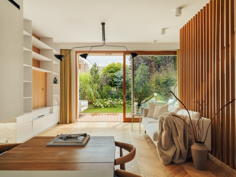 Jednym z atutów tej nieruchomości są spektakularne przeszklenia, które nie tylko nadają wnętrzu nowoczesnego charakteru, ale również doskonale doświetlają przestrzeń naturalnym światłem przez cały dzień. Dzięki dużym panoramicznym oknom mieszkańcy mogą cieszyć się niezakłóconym widokiem na otaczającą zieleń, co sprawia, że wnętrze harmonijnie łączy się z otoczeniem, tworząc atmosferę spokoju i relaksu.