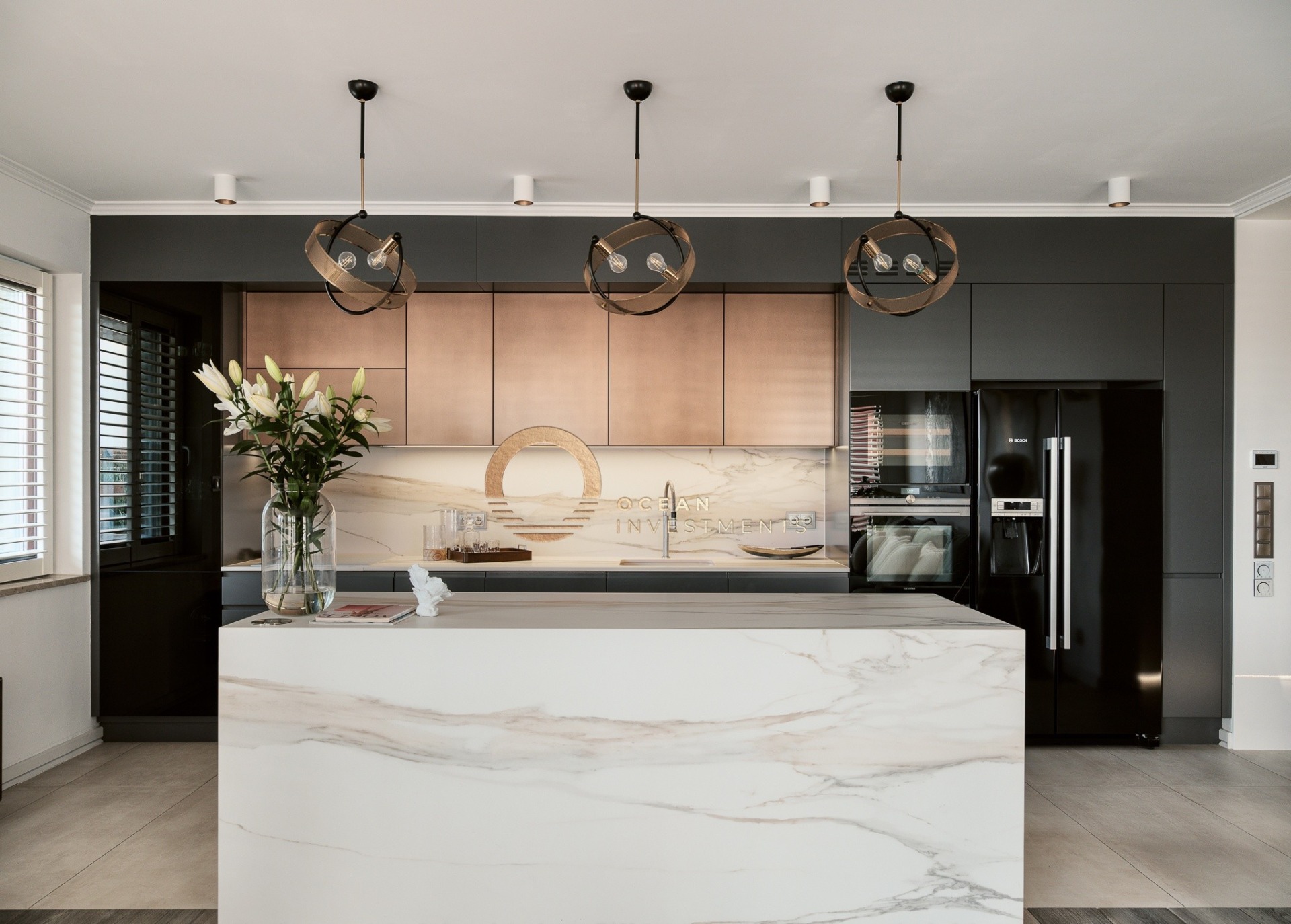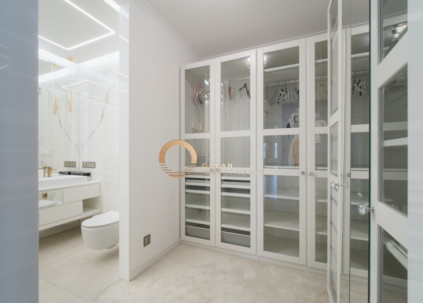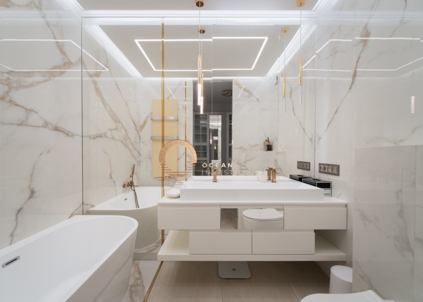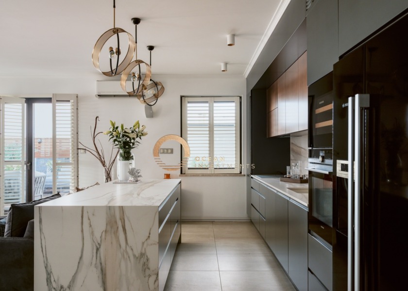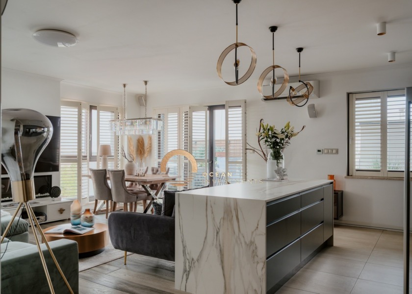 Apartament został wykończony z użyciem wysokiej jakości materiałów, z dbałością o detale i funkcjonalność. W części dziennej zastosowano ogrzewanie przypodłogowe, a kuchnię wykończono szlachetnym kamieniem Calacatta Gold w wykończeniu mat/satyna. Komfort użytkowania podnoszą m.in. chłodziarka do wina renomowanej marki LIEBHERR oraz podświetlane szuflady LED. Na tarasie zastosowano nawierzchnię z termicznie modyfikowanego drewna.